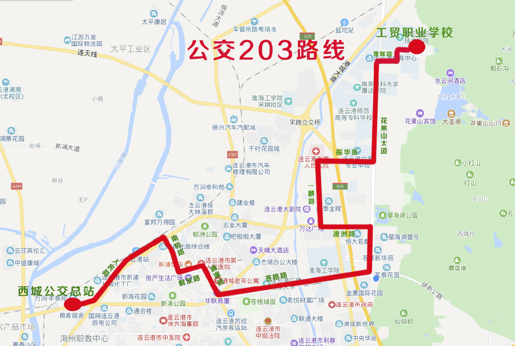 線路走向:西城公交總站發(fā)車海連路、人民路、南極路、解放路、通灌路、蒼梧路、花果山大道、凌洲路、一麟路、振華路、花果山大道、晨光路至工貿(mào)職業(yè)學(xué)校