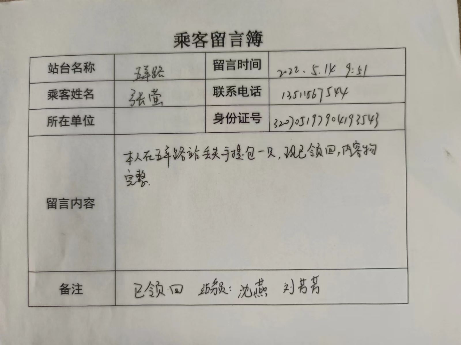 5月4日上午,新光路站當班站務員劉芳芳正在查驗乘客“雙碼”及測量體溫。就聽見有人在喊:“站務員,站務員!”劉芳芳便往喊聲處望去,只見一位乘客從B1車上下來邊跑邊喊,劉芳芳見狀急忙迎了上去并詢問發(fā)生了什么事情:原來是乘客上車太匆忙,車輛出站后發(fā)現(xiàn)自己的包丟在了五羊路站臺。在問清丟失包的特征及丟失位置后,劉芳芳立即返回票房聯(lián)系五羊路站站務員。在等待回復的時間,劉芳芳安撫乘客著急的心情,幾分鐘后,得到五羊路站站務員的回復說:“包找到了,讓乘客盡快來領取。”劉芳芳將這一消息告訴乘客,乘客連連表示非常感謝。又過了一會,五羊路站務員告知劉芳芳,失物乘客已領回并留下感謝信。