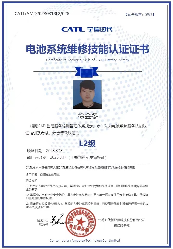 此次培訓(xùn)選派張強、徐金冬兩名一線維修人員參加寧德時代在武漢舉辦的《鋰動力電池》L2-A培訓(xùn),培訓(xùn)分為理論和實操,理論課內(nèi)容涉及認識商用車電池系統(tǒng)、電池均衡;實操課涵蓋了商用車上位機使用、安全作業(yè)防護與基本維修流程、充放電作業(yè)、商用車電池箱深度拆裝等重點內(nèi)容,參培人員利用5天的時間,參加培訓(xùn)的人員認真學(xué)習(xí),在實操訓(xùn)練中逐步熟悉和掌握電池拆裝及使用專業(yè)維修工具進行故障排查處理的維修技能,最終通過理論、實操考核工作,獲得了寧德時代頒發(fā)的L2級維修技能等級證書。