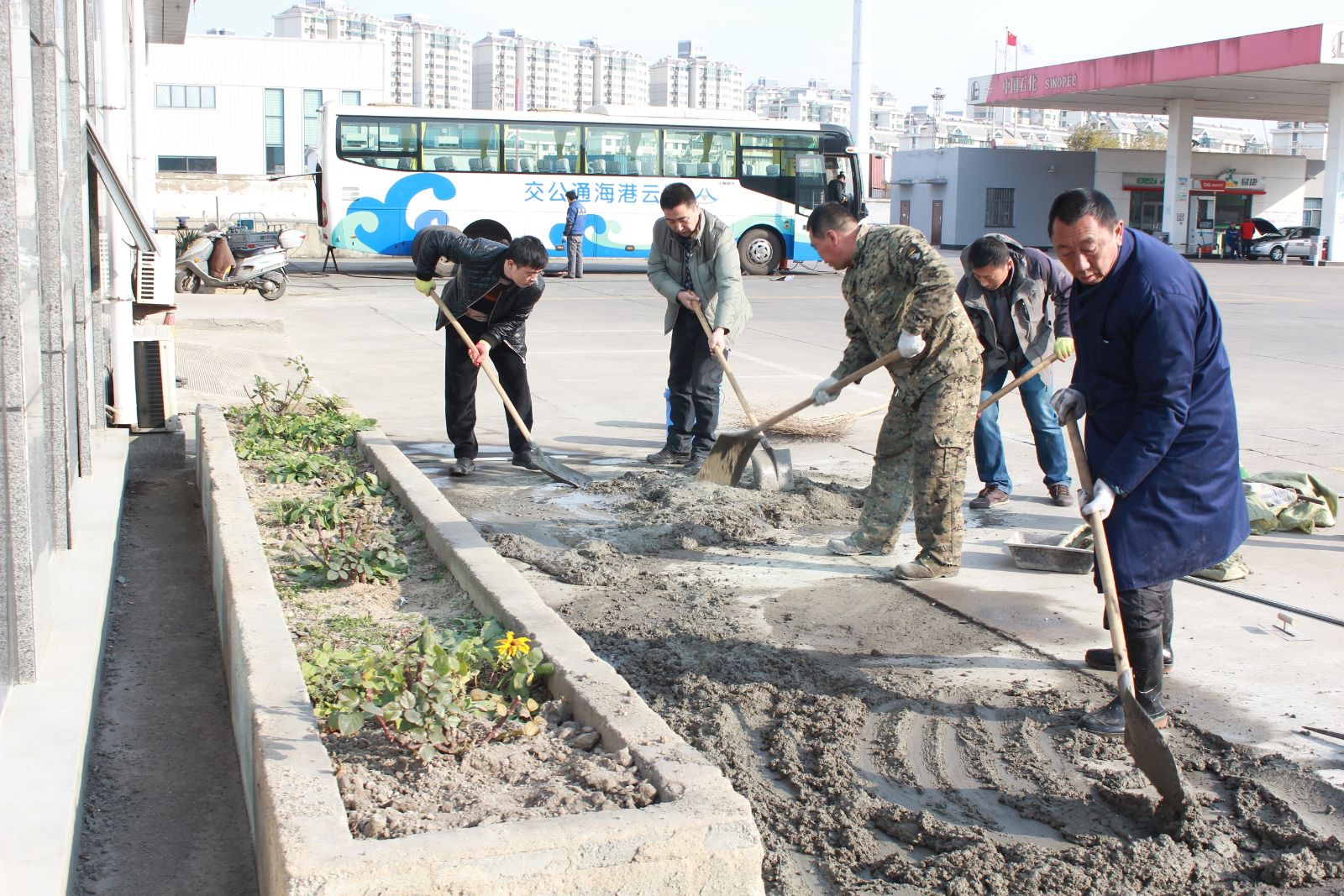 為做好創(chuàng)衛(wèi)工作,確保責任區(qū)域干凈、整潔及美化工作環(huán)境,12月9日上午,公交東部公司開展公司總站場地面修繕工作。公司副書記寧濘、副經(jīng)理張煒帶領(lǐng)管理人員將公司場站內(nèi)多處破損的水泥地面重新修補平整。由于缺少相關(guān)材料和工具,大家獻計獻策、分工合作,有的攪拌水泥、有的用抹子將水泥面抹平……整個過程進展很順利,地面修繕效果較好。