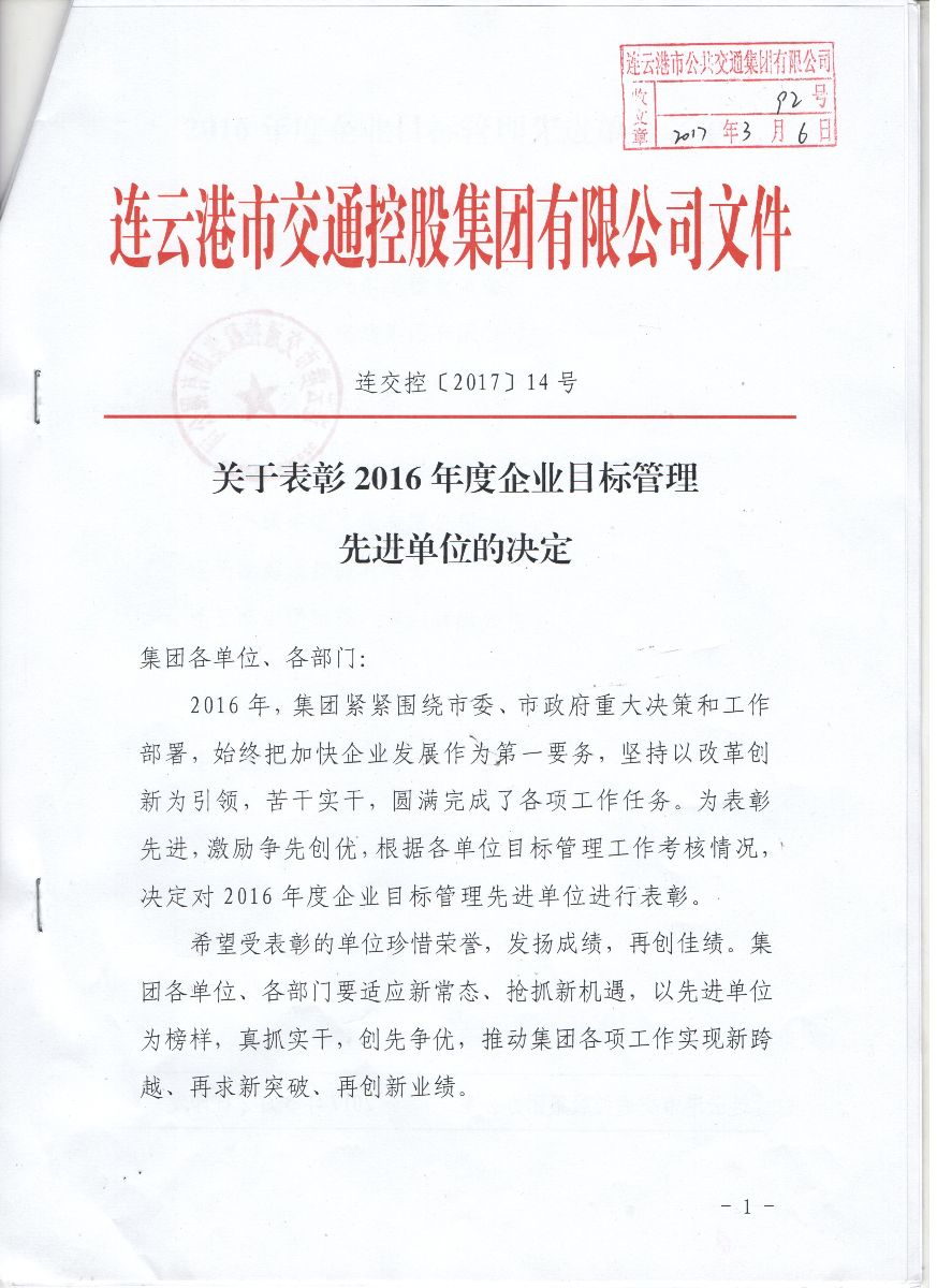 公交集團榮獲2016年度交控集團企業(yè)目標管理暨黨建、宣傳工作三項一等獎