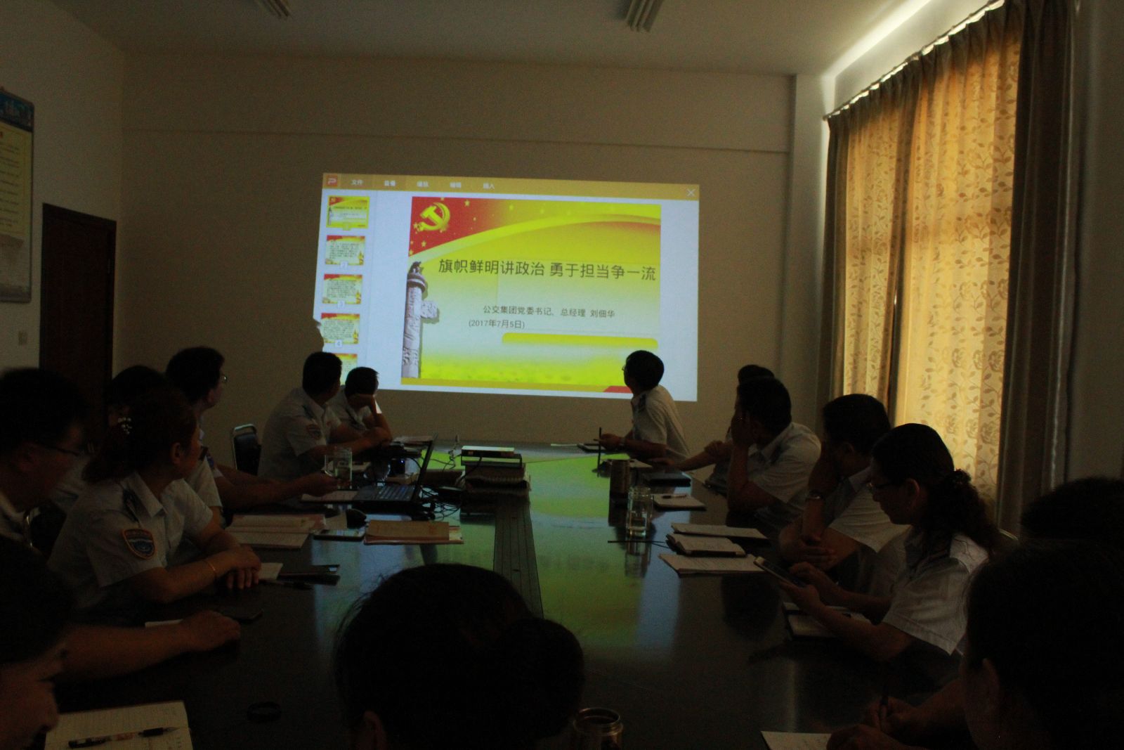 7月14日上午,公交東部公司黨支部召開“旗幟鮮明講政治”專題學(xué)習(xí),培訓(xùn)會由支部副書記寧濘主持。此次培訓(xùn)學(xué)習(xí),寧濘帶領(lǐng)大家學(xué)習(xí)公交集團(tuán)黨委書記、總經(jīng)理劉佃華以《旗幟鮮明講政治 勇于擔(dān)當(dāng)爭一流》為題的專題黨課,全面貫徹落實公交集團(tuán)黨委的各項工作部署和要求。最后,寧濘要求:一是黨員、干部一定要旗幟鮮明講政治,時刻注意自己的黨員形象,要為廣大職工當(dāng)表率。二是黨員、干部一定要敢擔(dān)當(dāng)、有作為,深入一線,密切聯(lián)系群眾,切實解決一線駕駛員的實際困難。三是全體員工要加強自身學(xué)習(xí),嚴(yán)格自律,干好本職工作,全力以赴做好當(dāng)前創(chuàng)文工作。