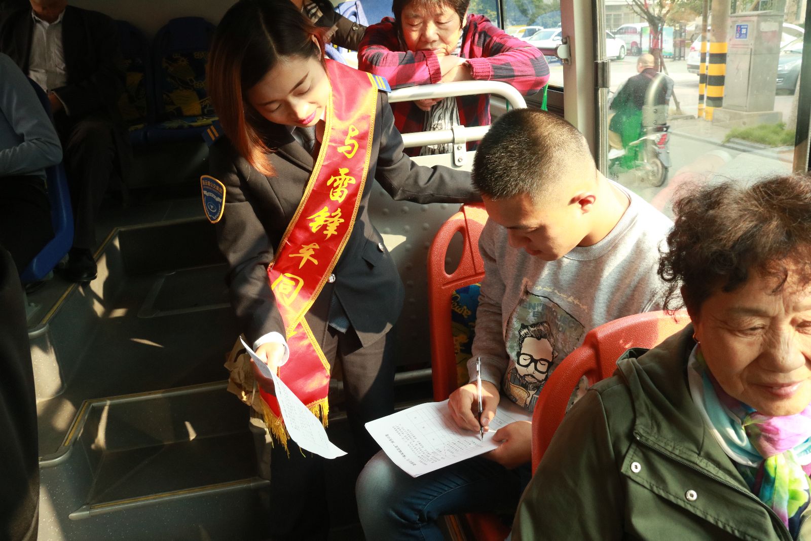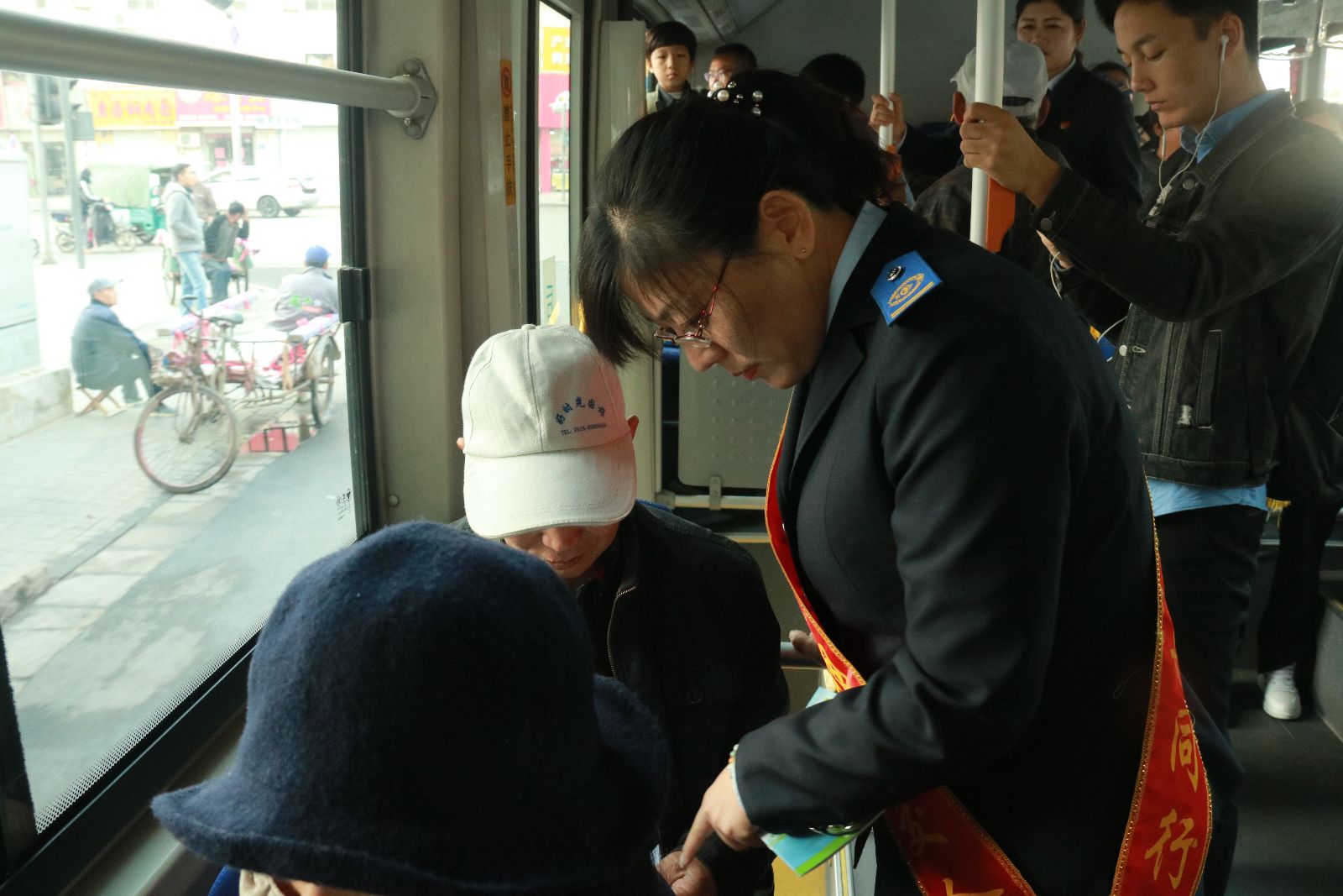 活動(dòng)當(dāng)天,23路“敬老文明線”投入全部10臺(tái)運(yùn)力,加密班次,并在23路“敬老文明線”車(chē)廂內(nèi)營(yíng)造敬老、愛(ài)老、助老的宣傳氛圍,增強(qiáng)市民敬老、愛(ài)老意識(shí)。參加活動(dòng)的行管后服人員在車(chē)廂內(nèi)為乘車(chē)?yán)夏耆擞纤拖路?wù)同時(shí)在車(chē)內(nèi)、站點(diǎn)發(fā)放公交出行手冊(cè),宣傳公交的同時(shí)宣傳敬老文化。