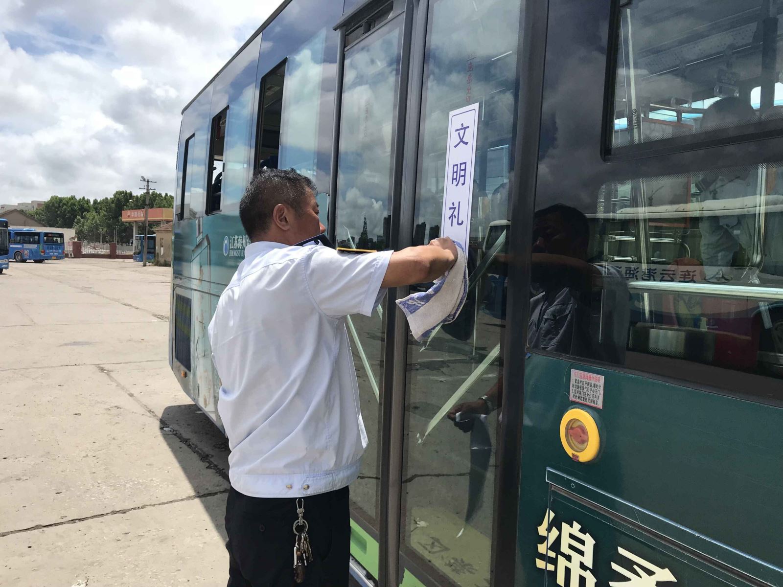 為進(jìn)一步加大創(chuàng)建文明城市宣傳力度,激發(fā)公交駕駛員創(chuàng)文熱情,大力營(yíng)造創(chuàng)建氛圍。近日,公交集團(tuán)海通公交公司組織管理人員對(duì)公司所屬車輛張貼新的創(chuàng)文宣傳標(biāo)語(yǔ)。