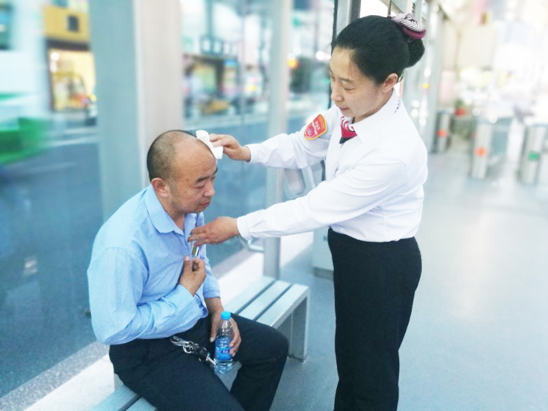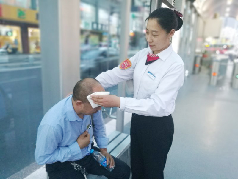 一次,我在移動公司站上晚班,有位老人下車后便趴在安全門上,我便用廣播安全提示:“乘客們,你們好,為了您的安全,請您不要趴靠安全門,請您退到安全線后耐心等待。”忽然看見老人倒地,我趕緊攙扶他坐到站內(nèi)椅子上,詢問他是怎么了,還沒開口,他就出現(xiàn)心慌手抖、嘔吐等現(xiàn)象。我趕緊撥打120,同時也像智能調(diào)度中心報告站臺的實況。等待120過程中,我一邊幫他擦汗,一邊輕拍他的胸口幫助他呼吸順暢。沒多久,老人的家人和120前后腳便到了,他的家人激動地握住我的手說:“太感謝你了,多虧有你們,我們家老年人身體一直不是太好,可是又喜歡出來散悶,今天如果沒有你在,真不知道怎么辦了。”當時聽了這話,我的心里感受到不一樣的溫暖,內(nèi)心無比自豪。我笑著對他們說:“這是我們應(yīng)該做的,您太客氣了。”