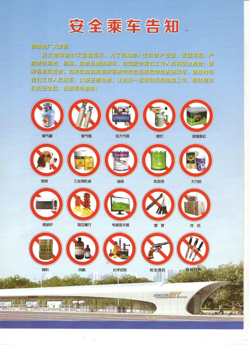 為確?;顒尤〉贸尚?,公司結(jié)合當前反恐維穩(wěn)嚴峻形勢,制作圖文并茂的安全生產(chǎn)宣傳資料——《海通公交安全乘車溫馨提示》,于咨詢?nèi)债斕煸诰琵埓笫澜鐝V場、BRT市民廣場站、新浦火車站廣場以及海州客運站面向廣大市民發(fā)放1500余份,提醒廣大乘客不要攜帶易燃易爆等危險品乘坐公交車,呼吁廣大乘客強化安全意識,人人爭做“安全員”,自覺維護乘車安全。