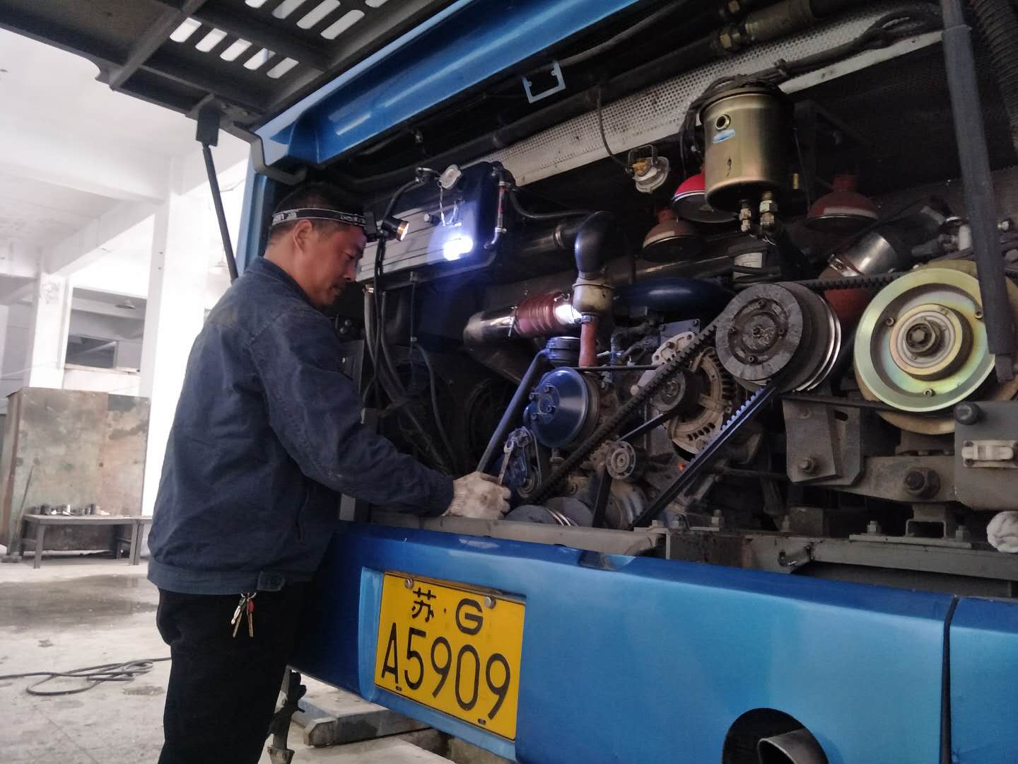 地溝只有幾十厘米寬,半人高,而且光線很暗,劉長倫佝僂著身子,帶著工作燈,鉆了進(jìn)去,為了吊變速器,修離合器,他得常常半蹲在一塊板上,彎著腰,將上半身探進(jìn)車底維修、保養(yǎng)車輛,短暫地結(jié)束工作從地溝鉆出來時(shí),手上、身上已經(jīng)滿是機(jī)油和污垢。對(duì)于這樣的狀態(tài),劉長倫習(xí)以為常,他每天進(jìn)入車間的維修車輛有40臺(tái)次左右,每個(gè)月至少需給七八十輛公交車做二級(jí)保養(yǎng),修理工每天6:30上班,20:30下班,如果遇到緊急維修任務(wù),還得加班加點(diǎn)。炎熱的夏季更加難熬,地溝又悶又熱,一天下來,每個(gè)人沾滿油漬的衣服、頭發(fā)都是濕了又干、干了又濕。遇上修發(fā)動(dòng)機(jī)這樣的活,為了避免帶入雜物,也不能帶手套,周邊都是金屬部件,不小心磕了碰了,在所難免,每個(gè)修理工的手上、胳膊上都有工作造成的劃傷。
