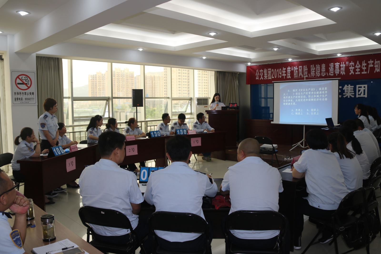 為扎實(shí)推進(jìn)全國(guó)第十八個(gè)“安全生產(chǎn)月”活動(dòng)的深入開(kāi)展,全面加強(qiáng)安全生產(chǎn)宣傳教育,普及安全生產(chǎn)知識(shí),提高職工安全素養(yǎng)和自我保護(hù)能力,6月27日,公交集團(tuán)在三樓會(huì)議室開(kāi)展了“防風(fēng)險(xiǎn)、除隱患、遏事故”安全生產(chǎn)知識(shí)競(jìng)賽,集團(tuán)黨委書(shū)記、總經(jīng)理周文君,副總經(jīng)理羅軍,副總經(jīng)理、工會(huì)主席劉永善,各職能部門(mén)負(fù)責(zé)人及集團(tuán)權(quán)屬單位領(lǐng)導(dǎo)班子、安全管理人員共70余人參加了此次活動(dòng)。