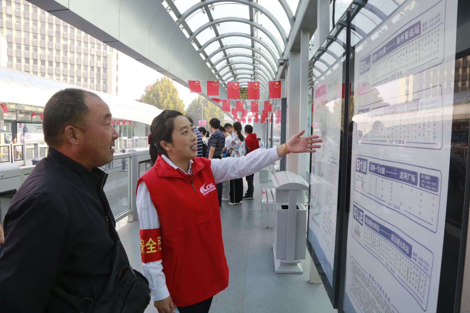 國(guó)慶期間,公交集團(tuán)給海州站、龍河廣場(chǎng)、購(gòu)物中心等十三個(gè)BRT站臺(tái)配備雙班站務(wù)員,同時(shí)配備手持金屬檢測(cè)儀,對(duì)乘客是否攜帶違禁品進(jìn)行準(zhǔn)確掃描。另外,我們還為每個(gè)換乘站配備了一名穿工作服佩戴紅袖章的安全員,協(xié)助站務(wù)員對(duì)乘客攜帶可疑包裹、物品進(jìn)行檢查,對(duì)可疑人員進(jìn)行詢問(wèn),杜絕危險(xiǎn)品進(jìn)站上車,進(jìn)一步提高BRT站臺(tái)的安全等級(jí)。