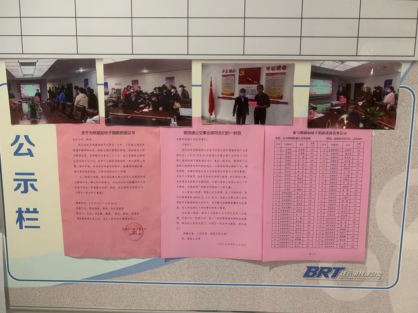 4月27日至29日,在快速公交事業(yè)部為職工熊斌如3歲幼子捐款活動正在進(jìn)行,辦公場所、各場站的小小的捐款箱前排起了長龍,一份份愛心猶如涓流,匯聚成支持熊斌如的強(qiáng)大力量。